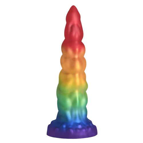 - Fantasy Dildo: This iridescent rainbow unicorn horn is tapered and has gradually larger bumps along the shaft.