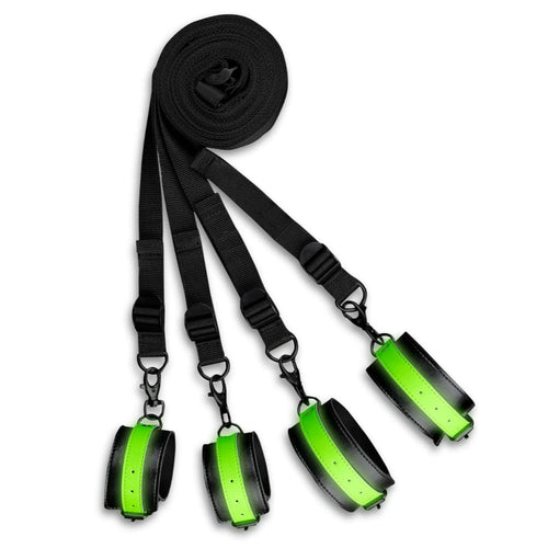 Includes: 4 Glow in the Dark Wrist/Ankle Cuffs with under bed strap anchor